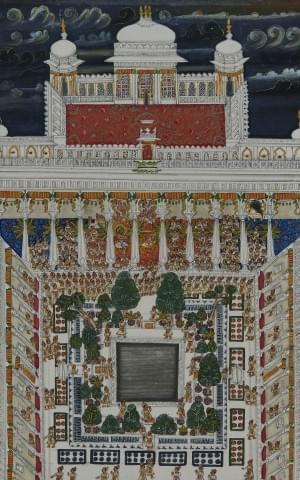Scène de palais avec jardin, miniature sur papier, 38x24 cm