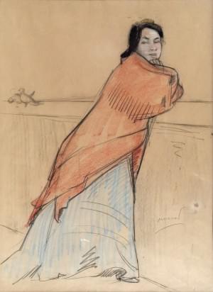 Femme au châle, crayon et fusain sur papier, 65x47 cm