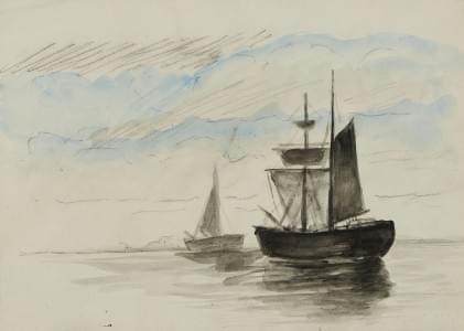 Ensemble de cinq dessins: l'homme attablé, barques et vapeur au...