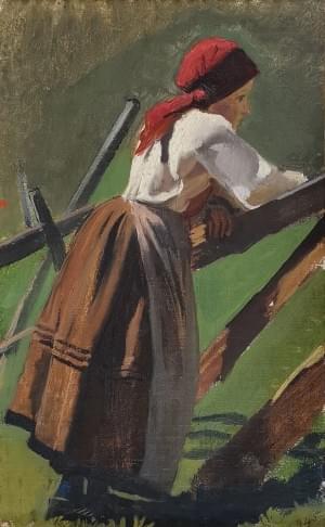 Jeune femme du val d'Hérens en fichu rouge, huile sur carton, 29...