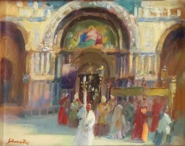 Procession à la sortie d'une église, huile sur panneau, 24x19,5...