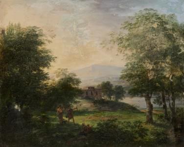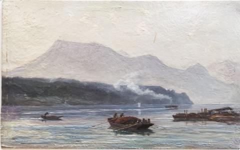 Pêche lacustre, huile sur carton, monogrammée et datée 1883, 16,...