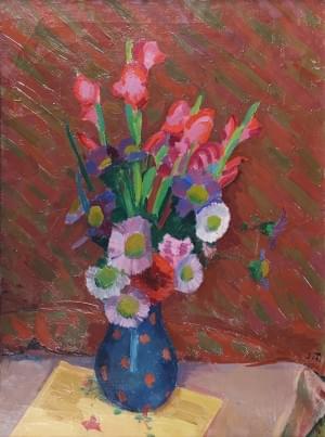 Bouquet de fleurs dans un vase à points, huile sur toile, monogr...
