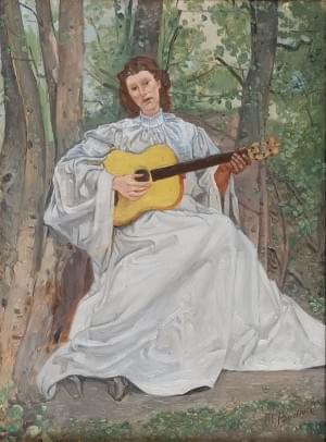 Jeune femme guitariste, huile sur pavatex, 31x24 cm