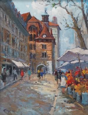 La place du Molard, huile sur toile, signature illisible, 60x46...