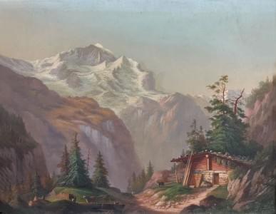 Chalet dans les Alpes, huile sur panneau, signée et située à Tho...