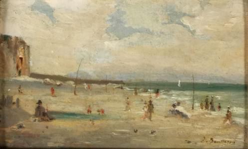 Scène de plage, huile sur panneau, signature apocryphe, 14x23 cm