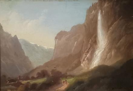 Vallée de Lauterbrunnen, huile sur carton, signé A. Calame, 16,5...