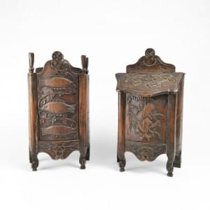 L'un à décor d'une tête de personnage, l'autre d'un chat, bois s...