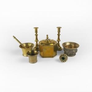 Cloche de vache, bougeoirs, mortiers et boîte