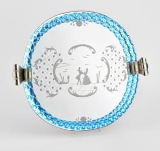 Verre gravé à motif de personnages, bordure en verre torsadé ble...