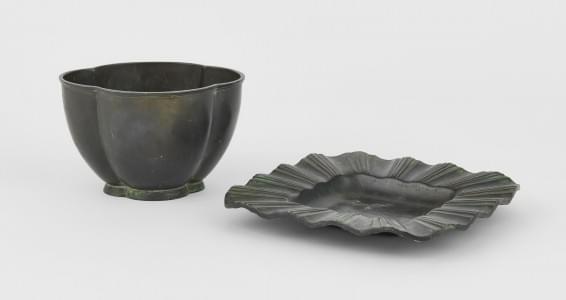 Coupe et un plateau, étain à patine bronze, H 8 et 15 cm