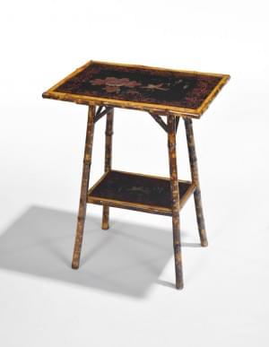 Bois laqué noir rouge et or à décor de fleurs, piètement en bamb...