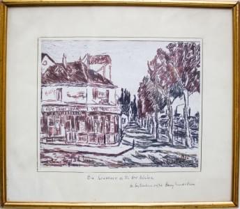 Café au bord de la Seine, encre sur papier, signé, 17x22 cm