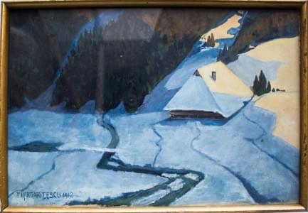 Chalet enneigé, aquarelle sur papier, signé T. Margaritescu et d...
