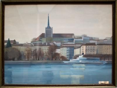 La cathédrale depuis le lac, gouache sur papier signée Stalder e...
