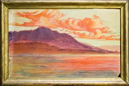 Lac, soleil couchant, gouache sur carton, signé, 30x48 cm