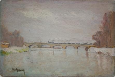 Locomotive sur le pont, huile sur carton, signé, 15x21 cm