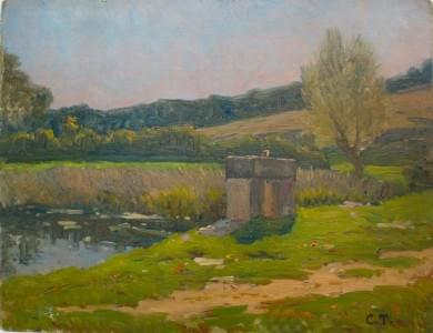 Au bord du lac, huile sur panneau, monogrammé, 26x35 cm