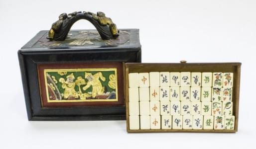 Jeu de Mah-Jong, dans un coffret en bois sculpté doré et peint,...