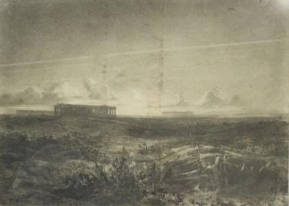 Les temples de Paestum, mine d'argent signée, 1844, 23x31,5 cm