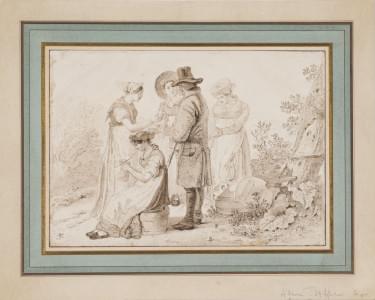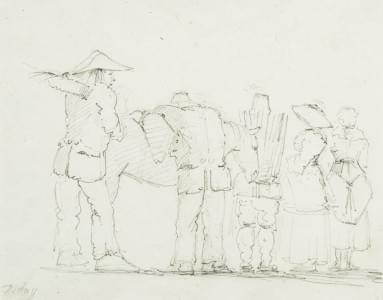 Paysans au bord du chemin, plume et lavis d'encre sur papier, 19...