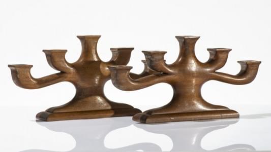 Paire de candélabres à cinq lumières, bois naturel, au dos étiqu...