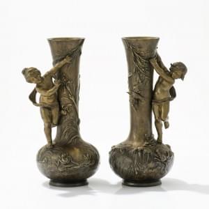 Paire de vases pansus à col évasé, régule à patine dorée à décor...