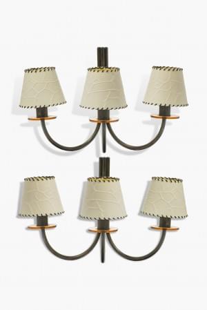 A trois lumières, bobèches en verre orangé, métal laqué noir, ci...