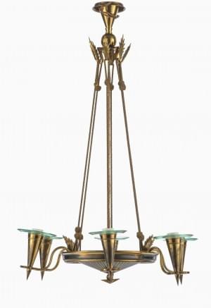 A six lumières, bronze patiné et doré, verre, H 104 cm, D 70 cm