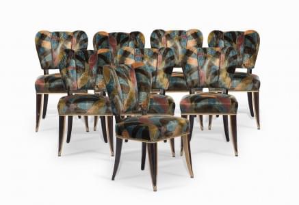 Suite de huit chaises, dossier cintré tripartite, bois teinté et...