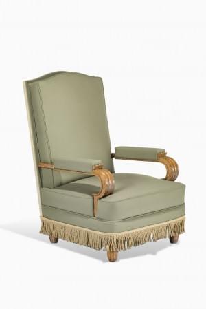 Fauteuil trône, chêne cérusé, drap de laine, circa 1940, 112x74x...