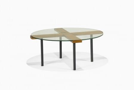 Bois fruitier, verre et métal laqué noir, H 39 cm, D 90 cm