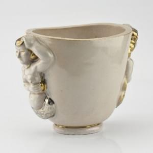 Coupe ovale à anses, Sirènes, céramique émaillée blanc et or, Ex...