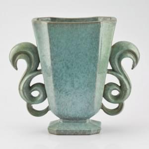 Vase à pans coupés, céramique émaillée turquoise, deux anses vol...