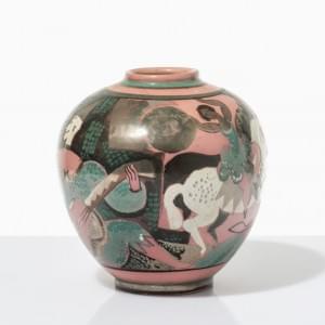 Vase boule, cirque, céramique émaillée vert, noir, argent sur fo...