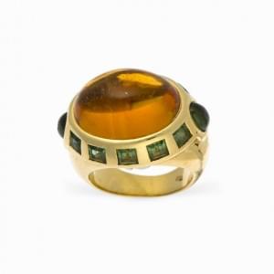 443. Bague sertie d'un cabochon de citrine entouré de tourmalines ver...