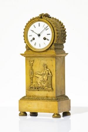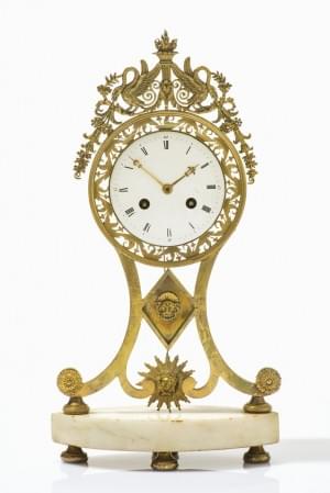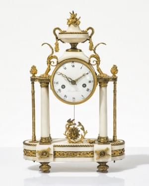 Montants en colonnes, marbre blanc et bronze doré, cadran émaill...