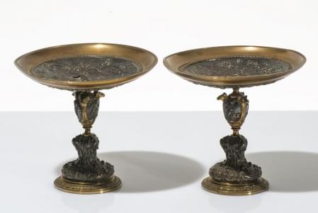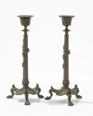 Paire de bougeoirs, bronze à patine brune à décor de serpent, H...