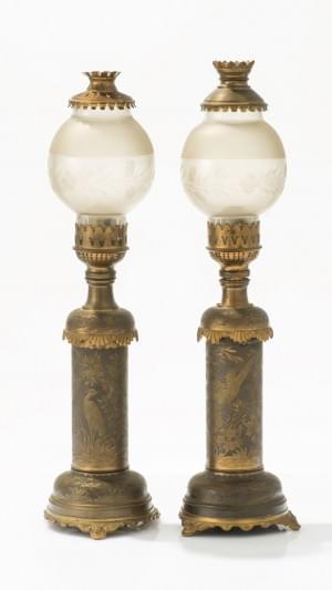 Paire de lampes à pétrole formant boîte à musique, fût cylindriq...