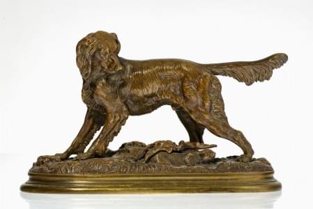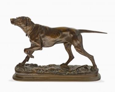 Chien de chasse, bronze à patine brune, signé, H 30 cm