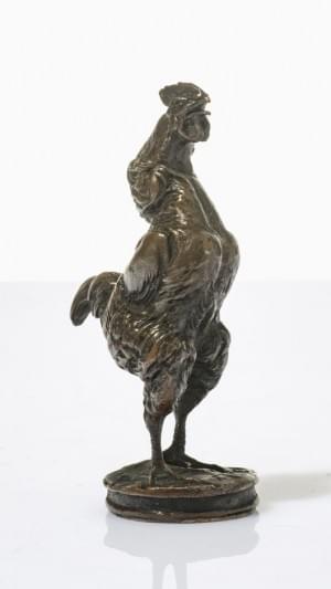 Coq debout, bronze à patine brune, signé, H 13 cm
