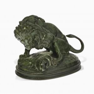 Lion attaquant un serpent, bronze à patine verte, signé, H 15 cm
