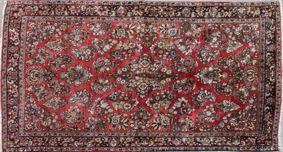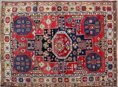 A décor géométrique sur fond rouge, laine, 135x181 cm