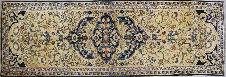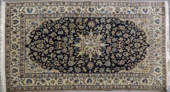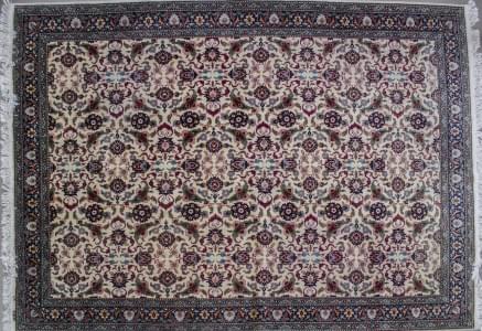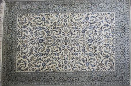 A décor de rinceaux bleus sur fond ivoire, double bordure, laine...