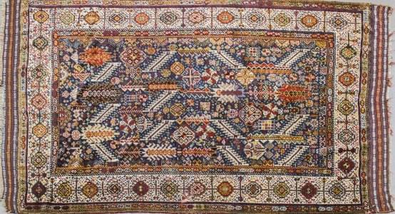 A décor de motifs stylisés sur fond bleu nuit, laine, 132x190 cm