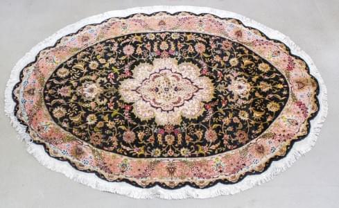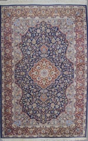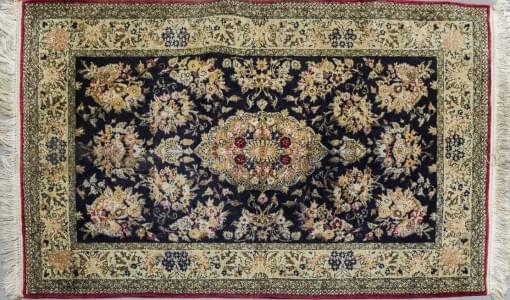 A motif rose sur fond bleu marine, laine et soie, 205x132 cm
