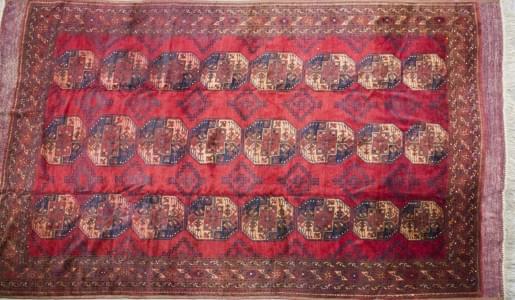 A décor de médaillons stylisés rouges sur fond beige, 170x123 cm