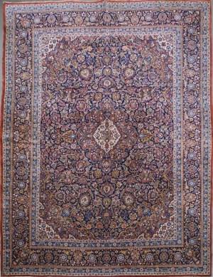 A décor de médaillon central sur fond bleu nuit, bordure mauve e...