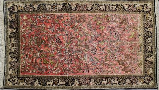 A décor d'un arbre, volatiles et animaux sur fond rose, soie, 12...